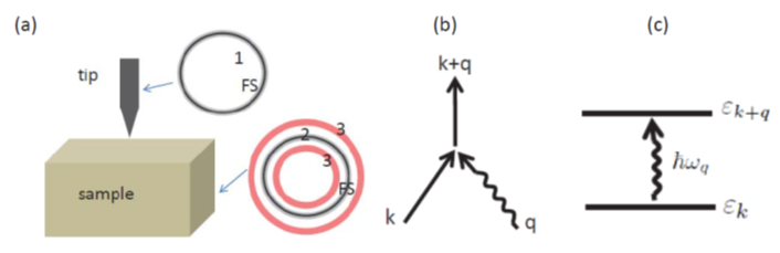 圖3:(a)測(cè)量示意圖以及非彈性隧穿相關(guān)的電子態(tài);(b)典型的電聲子耦合一階過(guò)程;(c)聲子參與的電子態(tài)激發(fā)