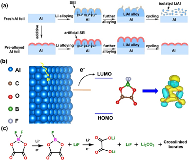 (a)通過(guò)同步預(yù)合金化以及構(gòu)筑人造SEI膜提高鋁負(fù)極循環(huán)穩(wěn)定性的機(jī)制;(b)DFOB-在鋁負(fù)極表面的還原機(jī)制以及DFOB-接受電子后的電荷差分圖;(c)DFOB-通過(guò)開(kāi)環(huán)反應(yīng)進(jìn)行還原和聚合的機(jī)制