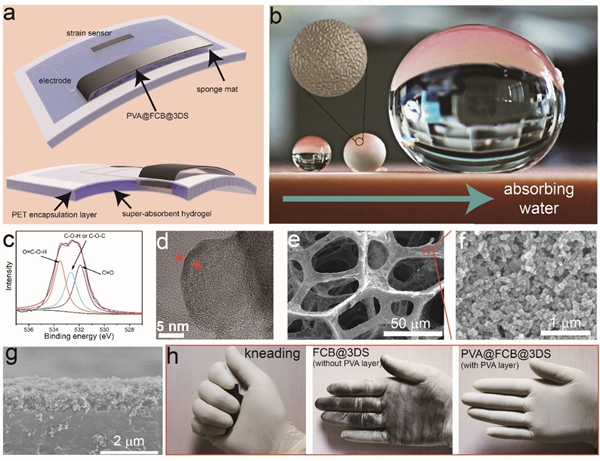 (a)水伏發(fā)電機(jī)的結(jié)構(gòu)示意圖。(b)超吸收性水凝膠吸水狀態(tài)的典型光學(xué)照片;(c)FCBs的高分辨率O1s X射線光電子能譜(XPS)光譜;(d)PVA@FCB的典型HR-TEM圖像;(e)PVA@FCB@3DS膜的掃描電子顯微鏡(SEM)圖像;(f)PVA@FCB層的高分辨率SEM圖像;(g)PVA@FCB@3DS膜的橫截面SEM圖像;(h)揉搓FCB@3DS薄膜和PVA@FCB@3DS薄膜過程及之后的典型光學(xué)照片。