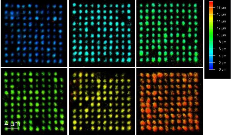 研究團隊提出一種基于透明膠帶的激光誘導熒光漂白實現(xiàn)超大容量光存儲的新方案。利用兼具無色和熒光特性的聚集誘導發(fā)光(Aggregation-induced emission, AIE)材料四苯基乙烯配置飽和溶液,將去掉膠后的一小塊透明膠帶浸泡其中,并用超聲振蕩的方式讓四苯基乙烯盡可能多的溶解。實驗發(fā)現(xiàn),在室溫環(huán)境下浸泡一段時間并清除掉表面所沉淀的染料分子后,四苯基乙烯分子由于分子熱運動會擴散到透明膠帶內(nèi)部,利用激光誘導雙光子熒光漂白可實現(xiàn)數(shù)據(jù)記錄。實驗中記錄了6層10*10的二進制數(shù)據(jù)點陣,并利用共聚焦顯微鏡進行數(shù)據(jù)讀取,其中,不同的顏色代表了不同的存儲深度。該成果首次將AIE材料成功應用于光存儲,進一步拓寬了AIE材料的應用領域。同時,由于透明熒光膠帶具有體積小、可制作長尺寸等特點,可實現(xiàn)超大容量光存儲。