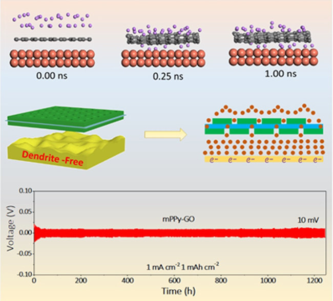 為了解決這個(gè)難題,吳忠?guī)泩F(tuán)隊(duì)提出了一種二維介孔異質(zhì)結(jié)構(gòu)雙功能鋰離子再分配新策略,設(shè)計(jì)并制備出二維介孔聚吡咯-氧化石墨烯異質(zhì)結(jié)新材料,利用二維介孔聚吡咯層的鋰離子有序通道和缺陷氧化石墨烯的納米篩的協(xié)同作用,實(shí)現(xiàn)了均勻的鋰離子分布,有效降低了電流密度,從而獲得了高穩(wěn)定、高容量且無(wú)枝晶的鋰金屬負(fù)極。鋰對(duì)稱電池(mPPy-GO-Li//mPPy-GO-Li)在高達(dá)1000次循環(huán)(2000 h)中保持高的庫(kù)倫效率(98%),在高電流密度(10 Ma/cm2)下具有平坦的電壓(70 mV)曲線,且無(wú)鋰枝晶生成。劉中民、葉茂團(tuán)隊(duì)提供了電場(chǎng)模擬計(jì)算支持,證明了該二維異質(zhì)結(jié)構(gòu)可以有效地使不穩(wěn)定的電流波動(dòng)均勻化。以該負(fù)極組裝的鋰/鈷酸鋰全電池表現(xiàn)出了優(yōu)異的倍率和循環(huán)穩(wěn)定性能。該工作為構(gòu)建安全性好、比能高、壽命長(zhǎng)的鋰金屬電池的二維異質(zhì)結(jié)構(gòu)提供了新思路。