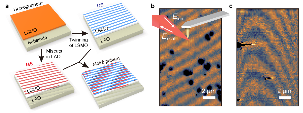 圖:a. 利用兩種不同應(yīng)力勢場的耦合在LSMO薄膜中實現(xiàn)摩爾調(diào)控的示意圖。 b.c. SNOM測量得到的電子相摩爾紋圖案,b為直線型,c為彎曲型。