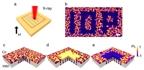 圖1. X射線誘導的交換偏置再定向效應。a為同步輻射X射線通過在垂直磁場(H)下掃描閉合區域誘導產生均勻的交換偏置,箭頭表示正的磁場方向,b為同步輻射X射線掃描后在零外磁場下測到的物理所(IOP)標志;c-e為對應的四分之三掃描透射X射線顯微鏡數據截面圖和相應的交換偏置示意圖,IrMn層箭頭表示界面垂直方向的反鐵磁序。b和e中標尺條為1μm。
