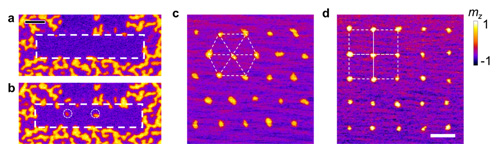 圖2. X射線誘導單個斯格明子及斯格明子晶體的產生。a為X射線誘導產生的閉合單疇條(白色虛線矩形框);b為控制X射線在單疇區域上精準產生的兩個斯格明子;c-d分別為X射線在單疇區域寫入的三角和正方斯格明子人工晶體。d中的標尺條為1μm。