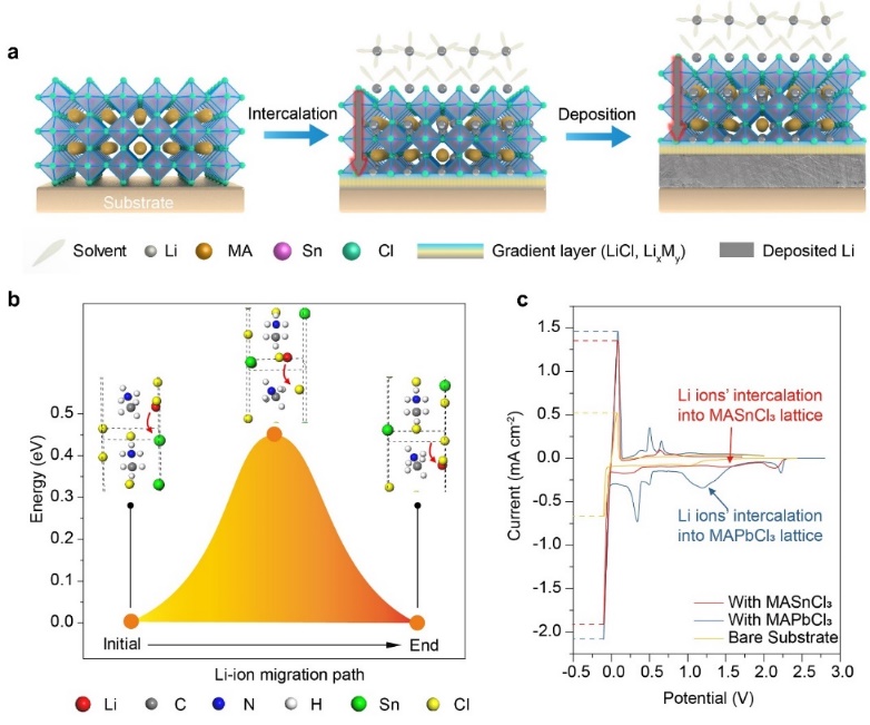 圖1 金屬鹵化物鈣鈦礦框架的鋰離子傳導(dǎo)特性機(jī)理探究。a,鋰離子在金屬鹵化物鈣鈦礦晶格中的遷移并均勻沉積在基底的示意圖。b,鋰離子在金屬鹵化物鈣鈦礦MASnCl3晶格中的遷移能壘計算。c,旋涂有金屬鹵化物鈣鈦礦薄膜電極的循環(huán)伏安曲線。