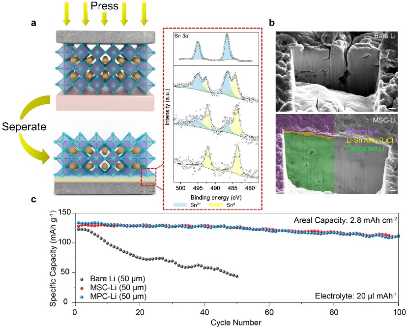 進(jìn)一步地,研究人員發(fā)展了方便的固相轉(zhuǎn)印方法,將旋涂法制備的高質(zhì)量氯基鈣鈦礦 (MASnCl3和MAPbCl3)薄膜原位地轉(zhuǎn)移到鋰箔表面,形成具有梯度結(jié)構(gòu)的導(dǎo)鋰層 (圖2 a)。該金屬鹵化物鈣鈦礦導(dǎo)鋰層可以改善電解液與鋰金屬的界面問題,實(shí)現(xiàn)致密的鋰金屬沉積和脫出,避免了鋰枝晶生長和鋰金屬電極的粉化(圖2 b)。最終的鋰金屬全電池電化學(xué)循環(huán)測試表明,在金屬鹵化物鈣鈦礦導(dǎo)鋰層的保護(hù)下,即使在貧鋰(50 μm)和有限電解液(20 μl mAh-1)以及2.8 mAh cm-2面容量的嚴(yán)格條件下循環(huán)100圈后容量仍保持在80%以上,而沒有保護(hù)層的鋰金屬電池在循環(huán)50圈后容量已降低到初始的40%(圖2 c)。