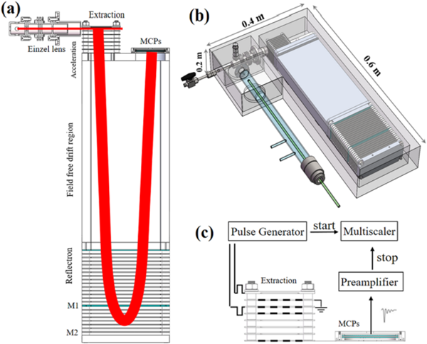 該團(tuán)隊(duì)副研究員唐小鋒和博士溫作贏等人,以真空紫外放電燈作為電離源,自行設(shè)計(jì)和研制了小型真空紫外光電離反射式飛行時(shí)間質(zhì)譜儀,并將之應(yīng)用于大氣自由基反應(yīng)動力學(xué)研究。通過設(shè)計(jì)具有籠式結(jié)構(gòu)的新型聚焦電場,實(shí)現(xiàn)了電離區(qū)內(nèi)離子的高效率收集,提高了質(zhì)譜儀的檢測靈敏度(自由基靈敏度達(dá)到0.3ppb)。同時(shí),通過采用垂直引入式結(jié)構(gòu)和二級空間聚焦等關(guān)鍵技術(shù),實(shí)現(xiàn)小型化質(zhì)譜儀高的質(zhì)譜分辨本領(lǐng)(M/△M = 2000, FWHM)。
