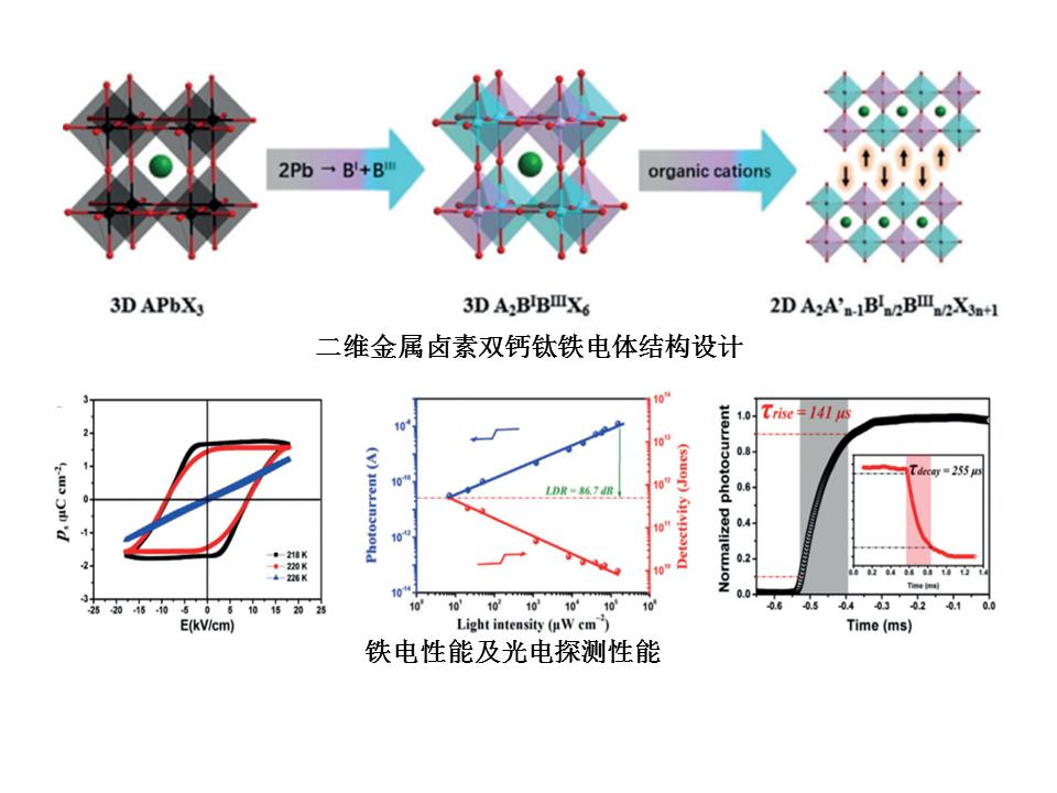 無機(jī)有機(jī)雜化鉛鹵素鈣鈦礦鐵電材料具有優(yōu)異的鐵電性能和半導(dǎo)體性能,近年來已經(jīng)成為光電功能材料的前沿研究方向。然而該類材料中鉛毒性一直是困擾其進(jìn)一步發(fā)展的一個(gè)問題。在鉛鹵素鈣鈦礦材料中,利用三價(jià)金屬(In3+、Bi3+、Sb3+)和一價(jià)金屬(Cu+、K+、Na+、Li+、Ag+)取代有毒元素Pb2+,構(gòu)筑金屬鹵素雙鈣鈦礦雜化材料,是一個(gè)設(shè)計(jì)合成非鉛無機(jī)有機(jī)雜化鈣鈦礦材料的有效手段和策略。同時(shí),這類材料還具有長的載流子壽命、高的缺陷容忍度、低的激子結(jié)合能等特點(diǎn),有望促進(jìn)高性能綠色光電材料的進(jìn)一步發(fā)展。