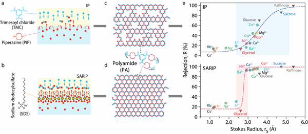圖1 (a)傳統界面聚合過程(IP)vs(b)表面活性劑有序單分子膜調控的界面聚合過程(SARIP);(c)和(d)IP和SARIP制備得到的聚酰胺分離層結構示意圖;(e)IP和SARIP過程制備得到的膜的實際分離性能對比圖。