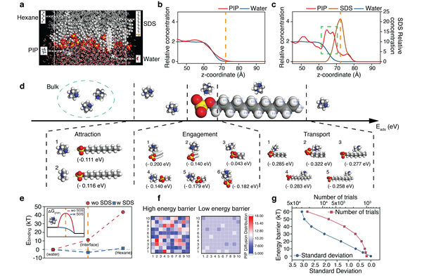 圖2 SARIP過程反應機理研究。(a-c)分子動力學(MD)模擬SDS有序單分子膜對PIP分子在水/油兩相界面處的分布的影響;(d)第一性原理(DFT)模擬SDS分子與PIP分子之間的相互作用;(e-g)蒙特卡洛(Monte carlo)模擬計算SDS有序單分子膜對于界面聚合過程中單體擴散的影響規律。