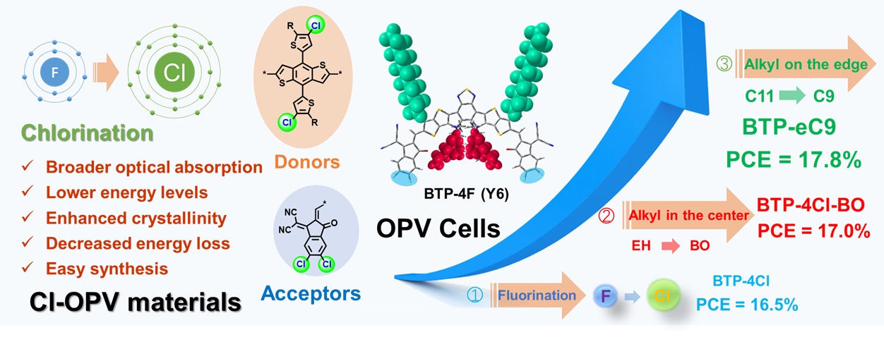 在北京分子科學(xué)國(guó)家研究中心、國(guó)家自然科學(xué)基金委和科技部的支持下,中國(guó)科學(xué)院化學(xué)研究所高分子物理與化學(xué)實(shí)驗(yàn)室侯劍輝課題組采取氯化方法設(shè)計(jì)高性能有機(jī)光伏材料,取得了系列進(jìn)展。聚合物給體方面,該課題組與北京科技大學(xué)副教授張少青合作,將苯并二噻吩(BDT)類聚合物PBDB-TF中的氟原子替換為氯原子,不僅大幅縮短了合成步驟,而且材料在電池器件中也表現(xiàn)出更高的光伏效率(Adv. Mater. 2018, 30, e1800868);非富勒烯受體方面,該課題組通過(guò)引入二氯氰基茚二酮作為端基,顯著地增強(qiáng)了分子內(nèi)電荷轉(zhuǎn)移效應(yīng),拓寬了材料的吸收范圍,相應(yīng)材料在各類型電池中都獲得了優(yōu)異的性能(Adv. Mater. 2017, 29, 1703080; Sci. China Chem. 2018, 61, 1328-1337; Adv. Mater. 2018, 30, 1800613; Nat. Commun. 2019, 10, 2515)。近期,該課題組系統(tǒng)總結(jié)了有機(jī)光伏材料的氯取代修飾方法,深入探討了相關(guān)的分子設(shè)計(jì)及光伏特征,相關(guān)內(nèi)容發(fā)表在Acc. Chem. Res. 2020, 53, 4, 822-832,論文第一作者為副研究員姚惠峰,通訊作者是研究員侯劍輝。