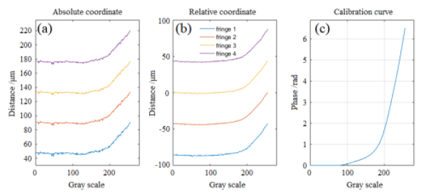 圖1.空間光調(diào)制器定標(biāo)實驗結(jié)果。(a)絕對坐標(biāo),,(b)相對坐標(biāo),(c)定標(biāo)曲線。