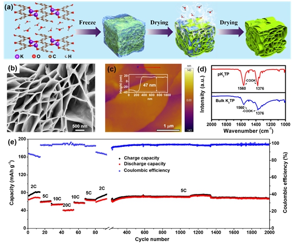 多孔有機K2TP負極的制備示意圖(a),多孔有機負極的掃描電鏡照片(b),AFM表征(c)和FT-IR譜(d);基于多孔有機負極的K-DIBs的長循環(huán)曲線(e)