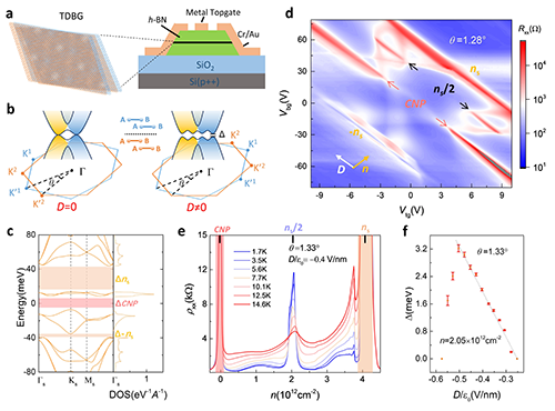 圖1. 轉(zhuǎn)角雙層-雙層石墨烯中的半填充關(guān)聯(lián)絕緣態(tài) a, 轉(zhuǎn)角雙層-雙層石墨烯摩爾超晶格和器件結(jié)構(gòu)示意圖;b, 能帶示意圖;c, 緊束縛模型的能帶計算結(jié)果;d, 雙柵調(diào)控下的電阻行為;e, 低溫下平帶半填充時的變溫絕緣體行為;f, 變溫擬合的半填充關(guān)聯(lián)絕緣態(tài)能隙隨垂直電場的響應(yīng)。