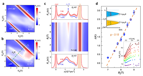 圖2. 平行磁場下半填充關(guān)聯(lián)絕緣態(tài)的增強效應(yīng) a, b, B||=0T和B||=9T時雙柵調(diào)控下的電阻響應(yīng);c, 平行磁場對半填充關(guān)聯(lián)絕緣態(tài)的誘導(dǎo)和增強;d, 半填充絕緣態(tài)能隙和平行磁場的關(guān)系。