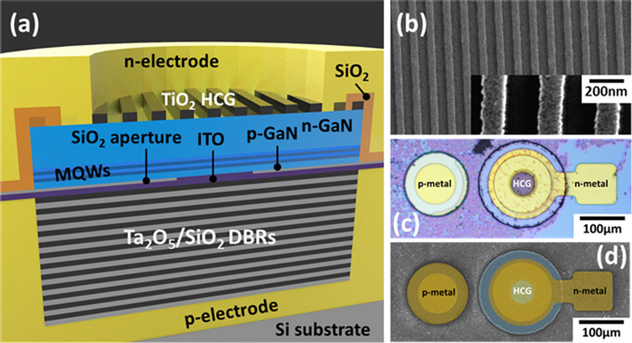 先制造VCSEL,再處理與硅基板的熱壓倒裝芯片鍵合,激光剝離去除了藍寶石襯底,并且還使用化學(xué)機械拋光(CMP)去除了其他GaN材料,從而形成了厚度為5μm的n-GaN表面。HCG光柵是通過濺射TiO2和SiO2,并隨后進行剝離圖案來制造。蝕刻使用電感耦合的等離子體反應(yīng)離子。光柵由間距為344.5nm的TiO2條組成。條帶高度和基極寬度分別為112.3nm和177.8nm。該器件通過電隔離以及n和p接觸金屬的沉積完成。