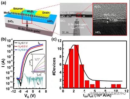 圖 1 (a)10nm柵長二硫化鉬晶體管的結構示意圖和TEM表征;(b)器件的轉移特性曲線;(c)器件的電流開關比分布統計圖。