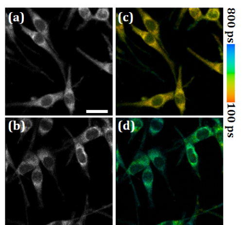 近紅外二區熒光壽命成像區分不同染料染色的細胞。(a)-(b) 熒光強度圖;(c)-(d) 熒光壽命標記圖。