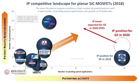 Knowmade在其報告《2019年功率SiC專利態勢》中分析,GE的專利活動在2000年代末開始,重點是SiC MOSFET的平面器件架構,GE是平面SiC MOSFET技術中最活躍的IP廠商,目前在全球擁有90多項已獲授權的專利,其中包括該領域的許多關鍵專利。并且GE在SiC MOSFET專利領域的專利活動有所放緩,這表明GE的SiC MOSFET技術已經達到了很高的成熟度。