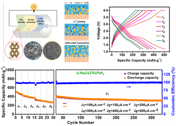 Li-Na/LLZO/FeF3固態(tài)電池構(gòu)架,共晶合金固-固對流示意圖,Li-Na/LLZO/FeF3電池的倍率和循環(huán)性能