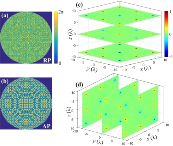 研究團隊理論研究了一類由徑向和角向偏振構(gòu)成的剪裁矢量光束,提出利用兩個高數(shù)值孔徑物鏡組成的4pi顯微聚焦系統(tǒng),實現(xiàn)同時攜帶兩種手性的手性光場的產(chǎn)生。通過矢量衍射積分計算該矢量光束經(jīng)4pi聚焦后的焦場分布并分析其光學手性特征,發(fā)現(xiàn)由于偏振特性,該聚焦矢量光束可以產(chǎn)生手性光場;并且如若只考慮聚焦場的軸向分量,可以產(chǎn)生光斑體積為l3/52(光斑直徑約l/6)的超分辨率手性光場。進一步地,為了使產(chǎn)生的光場同時攜帶兩種手性,研究團隊利用由矢量衍射理論推導的解析方法代替常用的耗時且缺乏物理意義的迭代方法,設計了一種多相掩模板來對入射矢量光束進行相位調(diào)控,產(chǎn)生了同時攜帶兩種手性分布的1D、2D甚至3D的多光斑手性光場,光斑的位置、數(shù)量以及旋向均可通過多相掩模板進行任意調(diào)控。