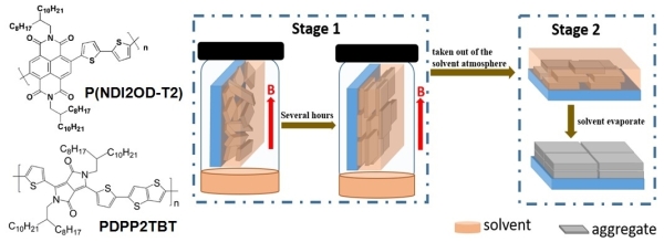 圖1.(a) 半導(dǎo)體聚合物P(NDI2OD-T2)和PDPP2TBT的分子結(jié)構(gòu);(b)強(qiáng)磁場(chǎng)誘導(dǎo)溶劑蒸汽退火(SVA-HMF)生長(zhǎng)取向薄膜的過(guò)程示意圖