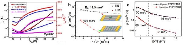 圖2.(a)基于磁致取向P(NDI2OD-T2)薄膜的TG/BC和BG/BC型OFET器件的轉(zhuǎn)移曲線;(b-c)P(NDI2OD-T2)(b)和PDPP2TBT(c)取向薄膜OFET的載流子遷移率隨溫度的變化關(guān)系