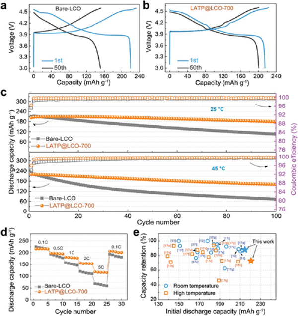 圖2. 未改性和LATP改性LiCoO2材料電化學性能對比