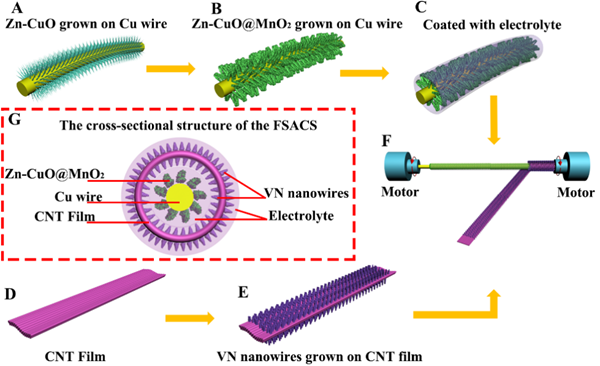 圖1.(A-F)同軸非對(duì)稱超級(jí)電容器制備示意圖。(G)同軸非對(duì)稱超級(jí)電容器截面示意圖