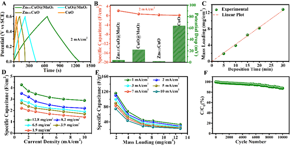 圖2.(A-B)CuO,CuO@MnO2,Zn0.11CuO and Zn0.11CuO@MnO2電極電化學(xué)充放電曲線及比容量與壓降圖。(C)MnO2負(fù)載量與沉積時(shí)間的關(guān)系。(D-E)Zn0.11CuO@MnO2電極在不同MnO2負(fù)載量時(shí)面積和質(zhì)量比容量的關(guān)系。(F)Zn0.11CuO@MnO2電極循環(huán)穩(wěn)定性