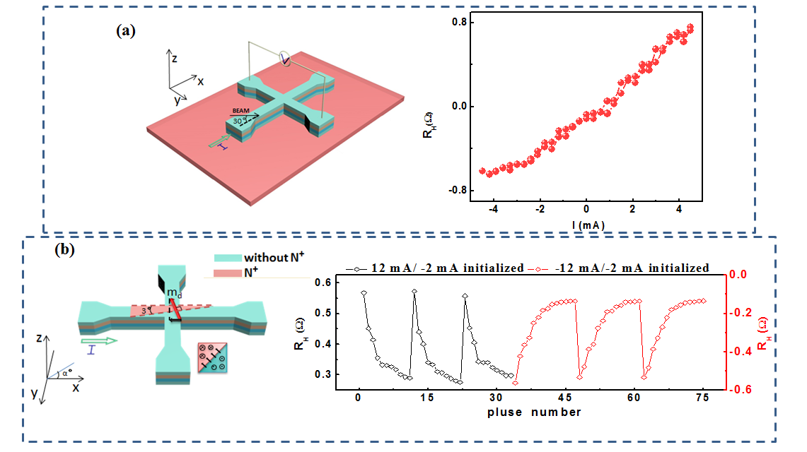 圖2、(a)離子注入引起的全線性磁化翻轉(zhuǎn),(b)局域離子注入注入實(shí)現(xiàn)的可編譯的突觸功能。