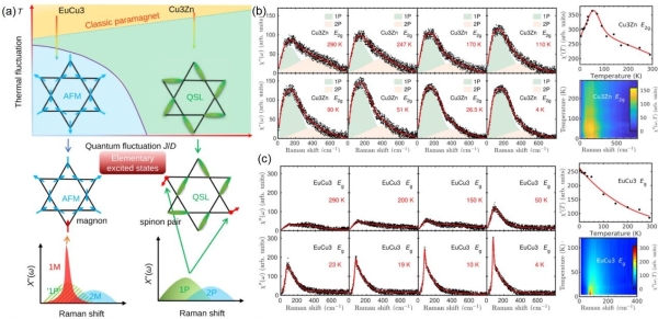 (a)反鐵磁體EuCu3(OH)6Cl3和量子自旋液體體系Cu3.18Zn0.82(OH)6FBr的磁激發(fā)示意圖;(b)Cu3.18Zn0.82(OH)6FBr和(c)EuCu3(OH)6Cl3隨溫度變化的拉曼光譜、拉曼磁化系數(shù)和拉曼響應