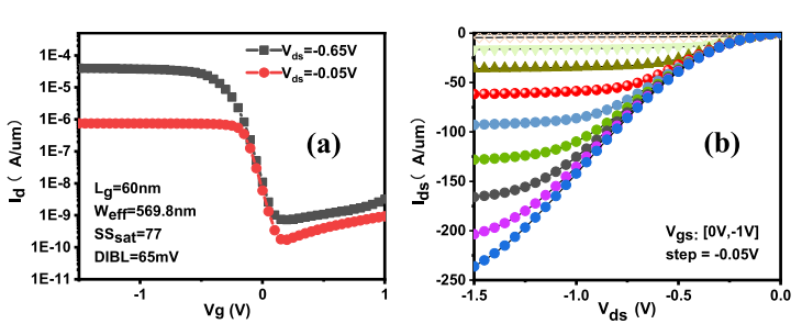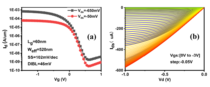 先導(dǎo)中心團(tuán)隊提出并制備了具有自對準(zhǔn)高K金屬柵、且精確控制有效柵長的pVSAFET器件,系統(tǒng)性研究了各向同性qALE工藝,并將其用于pVSAFET的制備;針對器件樣品,研究了VSAFET的特性,以及金屬硅化物工藝、Si-Cap、溝道Ge含量和熱處理過程等器件性能影響因素:發(fā)現(xiàn)較高的熱預(yù)算*會導(dǎo)致硼離子從漏源區(qū)擴(kuò)散到溝道,導(dǎo)致電性能差;而較低的溝道Ge含量、Si-Cap和TiAlC功函數(shù)層有助于提高晶體管閾值電壓。