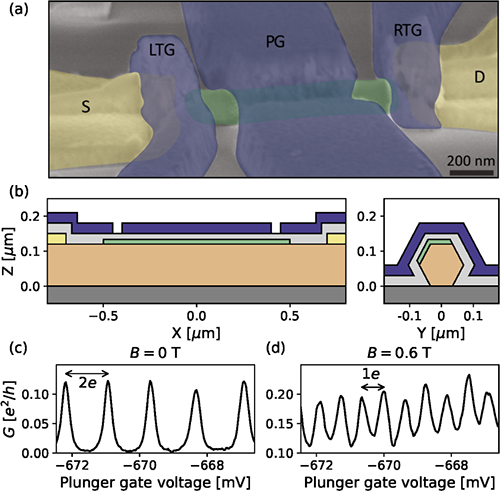 圖1.島器件的實物圖(a)和截面示意圖(b:縱切面、c:橫切面)。零場下庫倫振蕩是2e周期的(c),到0.6T劈裂成1e周期(d)。