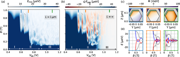 圖3.理論計算的相圖(a)和拓撲能隙(b),其中深紅色對應好的拓撲態(tài),在對應實驗的相圖中的轉(zhuǎn)變區(qū)間(第二個區(qū)間)。(c)給出了三種區(qū)間不同門電壓(化學勢)下橫截面內(nèi)波函數(shù)的分布,以及相應的超導能隙內(nèi)態(tài)隨磁場的變化。