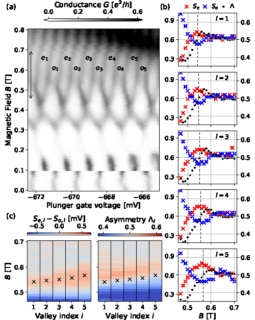 圖4.在第二個區(qū)間內(nèi)具體的庫倫振蕩電導峰隨化學勢和磁場而變化的二維圖(a)。不同門電壓上每一對庫倫振蕩電導峰的間距和峰值隨磁場的變化畫在圖(b)中,紅藍叉線分別對應奇和偶數(shù)電子對應的振蕩間距,黑色點線對應奇和偶數(shù)電子對應的振蕩電導峰的比值。可以看到兩者振蕩是鎖定的,黑色的0.5值對應紅藍線的極值點,這反映了電子隧穿島占據(jù)的準粒子態(tài)的粒子-空穴對稱性,與理論預言的馬約拉納零能模的隱形傳輸符合。圖(c)中的“X”指的便是上述的關聯(lián)點。