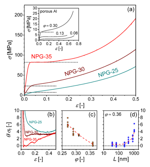 圖1.納米多孔金的壓縮變形行為。(a)不同相對密度納米多孔金的壓縮應力應變曲線,小圖為不同相對密度常規(guī)多孔鋁的壓縮應力應變曲線;(b)不同相對密度納米多孔金歸一化后的加工硬化率隨壓縮應變的變化情況;(c)納米多孔金歸一化加工硬化率隨相對密度的變化;(d)相對密度為0.36的NPG-35樣品的加工硬化率隨孔棱尺寸的變化情況