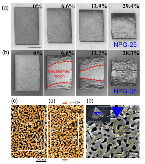 圖2.納米多孔金的均勻與非均勻變形。相對密度為0.27的NPG-25樣品。(a)和相對密度為0.36的NPG-35樣品;(b)壓縮不同應變后的表面形貌光鏡照片;(c-d)為NPG-25樣品壓縮20%前后局部變形情況,可見孔棱發(fā)生彎曲變形和懸掛孔棱發(fā)生搭接;(e)壓縮10%的NPG-35中,變形帶內(nèi)的孔棱發(fā)生位錯雪崩式滑移變形的痕跡