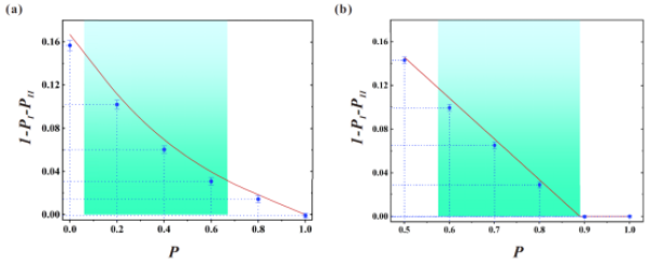 高維量子糾纏態(tài)的最優(yōu)檢測實(shí)驗(yàn)結(jié)果,(a)和(b)是兩種不同的非最大糾纏態(tài),圖中綠色區(qū)域中的糾纏態(tài)不能用基于保真度的糾纏目擊方法檢測