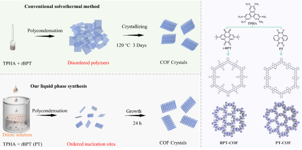近平衡液相法與傳統溶劑熱法制備二維有機框架材料的對比。左上圖為傳統溶劑熱法,需要高溫、高壓、封管等苛刻條件,聚合后通過長時間晶化,形成框架材料;左下圖為近平衡液相生長法,在稀溶液、開放體系中直接成核、生長,形成框架材料,室溫下制備,條件相對溫和;右圖為本工作制備BPT-COF和PT-COF兩種二維有機框架材料的示意圖