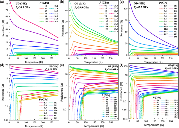 Bi2Sr2CaCu2O8+δ銅氧化物超導(dǎo)體在不同壓力下面內(nèi)電阻(R)-溫度(T)依賴關(guān)系。圖(a)和圖(d)為欠摻雜(UD)樣品的R-T曲線;圖(b)和圖(e)為最佳摻雜(OP)樣品的R-T曲線;圖e中兩個(gè)臺(tái)階式的轉(zhuǎn)變?yōu)?D-3D的超導(dǎo)躍變【Nature Physics 16(2020)295】;圖(c)和圖(f)為過(guò)摻雜(OD)樣品的R-T曲線。