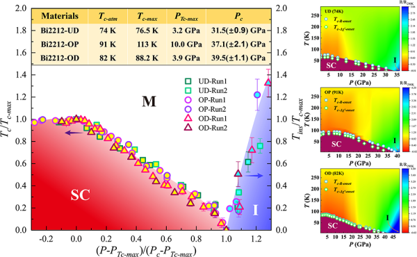 Bi2Sr2CaCu2O8+δ 銅氧化物超導(dǎo)體的壓力-溫度歸一化相圖。紅色區(qū)域?yàn)槌瑢?dǎo)態(tài),藍(lán)紫色區(qū)域?yàn)轭惤^緣態(tài)。