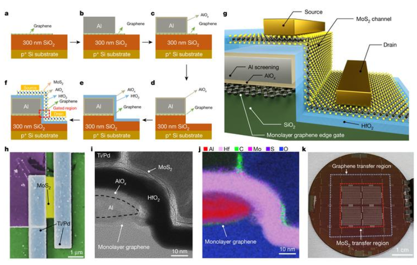 為進(jìn)一步突破 1 納米以下柵長(zhǎng)晶體管的瓶頸,本研究團(tuán)隊(duì)巧妙利用石墨烯薄膜超薄的單原子層厚度和優(yōu)異的導(dǎo)電性能作為柵極,通過(guò)石墨烯側(cè)向電場(chǎng)來(lái)控制垂直的 MoS2 溝道的開(kāi)關(guān),從而實(shí)現(xiàn)等效的物理柵長(zhǎng)為 0.34nm。通過(guò)在石墨烯表面沉積金屬鋁并自然氧化的方式,完成了對(duì)石墨烯垂直方向電場(chǎng)的屏蔽。再使用原子層沉積的二氧化鉿作為柵極介質(zhì)、化學(xué)氣相沉積的單層二維二硫化鉬薄膜作為溝道。具體器件結(jié)構(gòu)、工藝流程、完成實(shí)物圖如下所示: