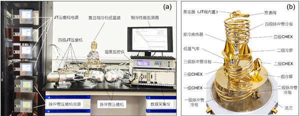 上海技物所1~2 K溫區復合制冷機典型實物圖 (a)系統整體布置;(b) 低溫端細節