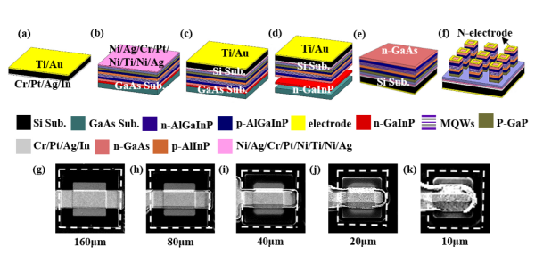 中國科學(xué)院長(zhǎng)春光學(xué)精密機(jī)械與物理研究所應(yīng)用光學(xué)國家重點(diǎn)實(shí)驗(yàn)室梁靜秋研究團(tuán)隊(duì)使用晶圓鍵合和襯底轉(zhuǎn)移技術(shù),制備五種像素尺寸(最小尺寸為10μm)的硅襯底AlGaInP紅光Micro-LED以探究其尺寸效應(yīng)。研究采用低損傷刻蝕技術(shù)減小LED芯片側(cè)壁缺陷;采用散熱性能更好的硅襯底代替GaAs襯底,改善LED芯片的散熱性,且避免GaAs襯底對(duì)紅光的吸收。實(shí)驗(yàn)結(jié)果表明,隨著尺寸的減小,Micro-LED芯片的外量子效率下降,但可承受的最大電流密度增加,高注入電流下散熱性改善,且中心波長(zhǎng)隨注入電流的偏移減小。