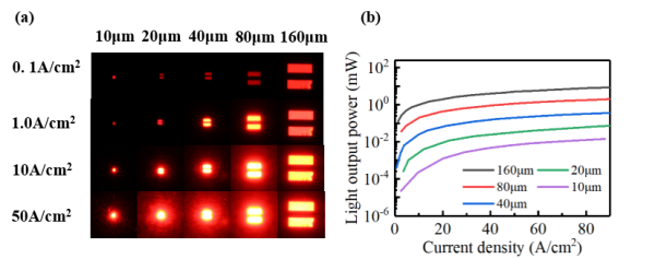 圖3.(a)不同尺寸Micro-LED的電致發(fā)光圖像;(b)不同芯片尺寸的光輸出功率特性
