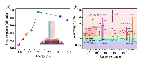 基于層狀InSiTe3光電探測器的(a)光譜響應與 (b)已經報道的部分二維材料光電探測器的性能對比圖
