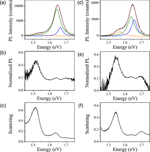 圖2.銀納米線-單層WSe2耦合體系的熒光譜(a、d),歸一化的熒光譜(b、e)及對(duì)應(yīng)的散射譜(c、f)