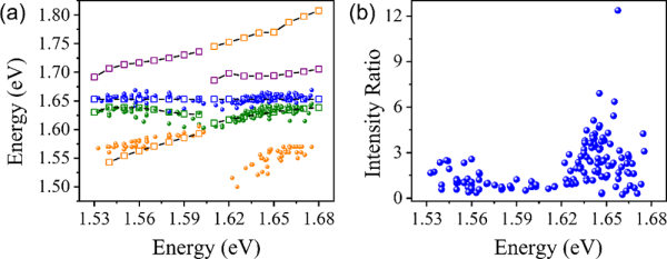 圖3.(a)實(shí)驗(yàn)熒光譜(實(shí)心點(diǎn))及計(jì)算熒光譜(空心點(diǎn))擬合峰的能量隨低能量等離激元模式的能量E1的變化關(guān)系,(b)實(shí)驗(yàn)熒光譜中低能量極化激元峰與激子峰的強(qiáng)度比值隨E1的變化關(guān)系