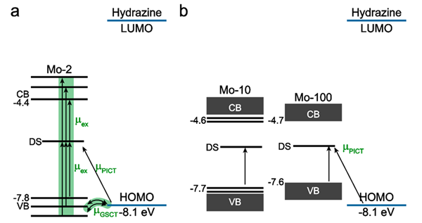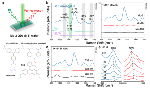 基于這一研究目標(biāo),中國科學(xué)院蘇州納米技術(shù)與納米仿生研究所研究員趙志剛團隊設(shè)計了一系列不同尺寸的氧化鉬納米晶和量子點,發(fā)現(xiàn)了小尺寸的量子點在晶格缺陷和尺寸效應(yīng)的雙重作用下SERS性能顯著提升,提出了基于多重共振耦合電荷轉(zhuǎn)移路徑實現(xiàn)高效化學(xué)增強效應(yīng)的SERS作用機制,并實現(xiàn)了對無機小分子聯(lián)氨(N2H4)的低濃度檢測。